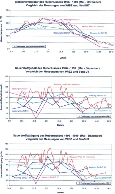 Eine grafische Übersicht der gemessenen Sauerstoffwerte und weiterer Parameter im Jahresvergleich 1996-1999 ist im Anhang, Anlage 7 zusammengestellt.